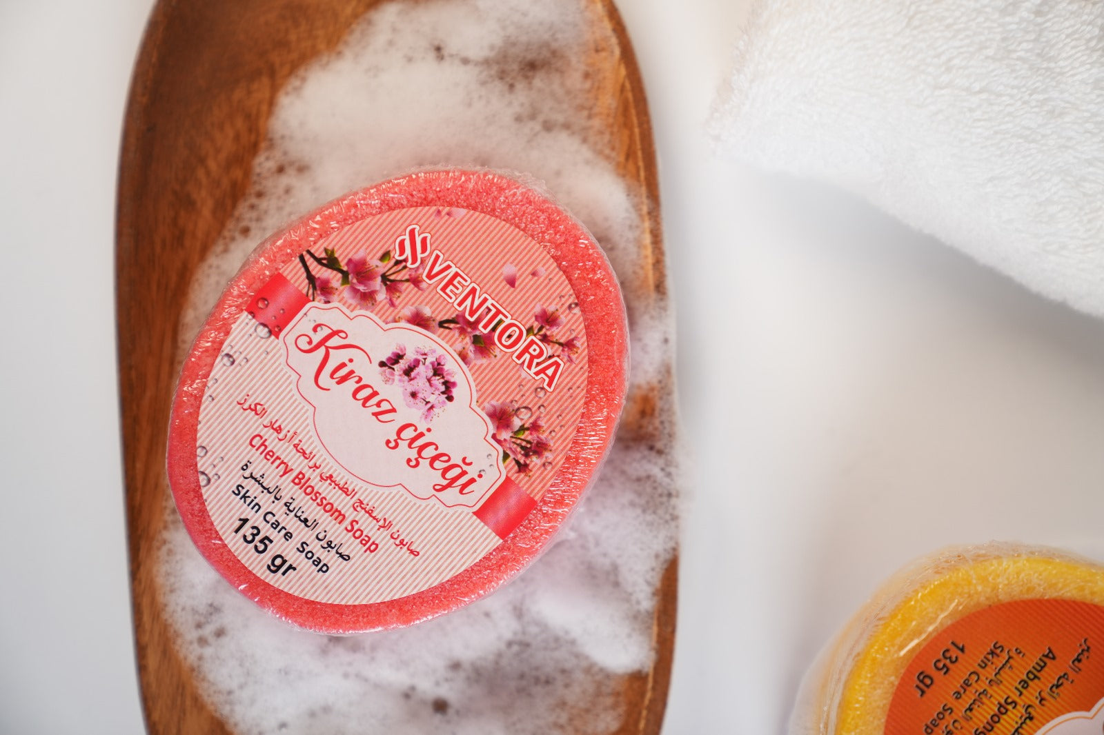 Embrace delicate luxury with VENTORA’s Cherry Blossom Natural Sponge Soap. Infused with the subtle floral scent of cherry blossoms, this soap: